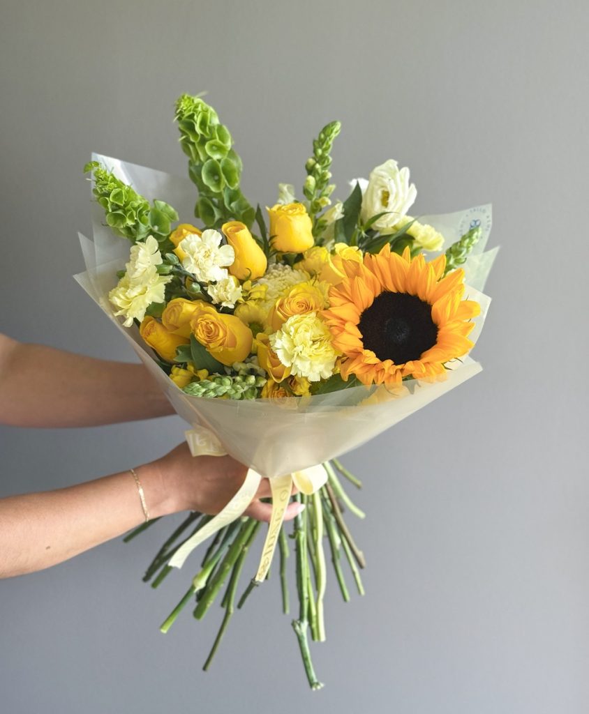 Un arreglo lleno de luz y vitalidad en tonos amarillos, perfecto para transmitir alegría.  Combinación de rosas, snapdragons, girasol, claveles, lisianthus, campana