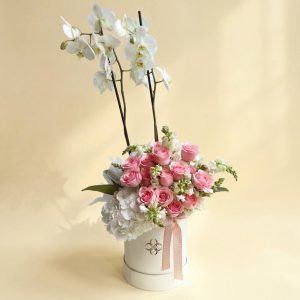 • orquídea phalaenopsis de 2 tallos en su maseta, snapdragons, rosas y hortensia