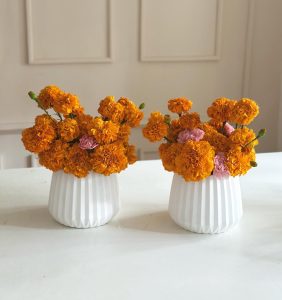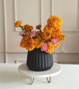 Base de plástico reutilizable como maseta, con flor de temporada cempasúchil y claveles ideal para decoración de otoño